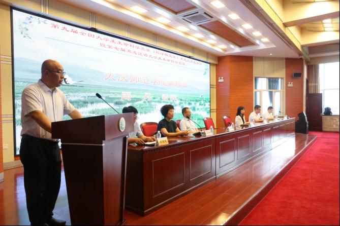 大庆师范学院副校长周丹代表学校在大赛开幕式上致欢迎辞,对各位专家的莅临表示欢迎,向长期以来支持和帮助大庆师范学院发展的专家致以衷心感谢。并表示希望以此次大赛为契机,与兄弟高校开展更多的交流合作,携手共进,共同为推动龙江高等教育高质量发展做出应有贡献!